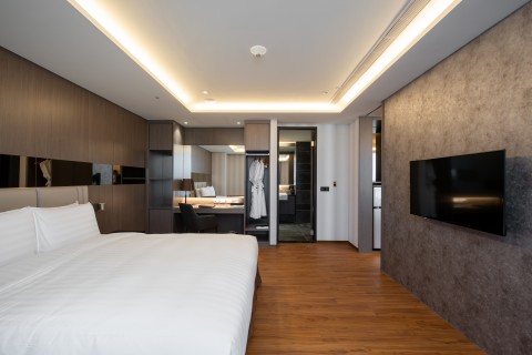 細やかな点にまで行き届いたシンプルな設計のお部屋です。ビジネスでご来店頂いたお客様にも、家で寛いでいるような安らぎを感じて頂けるよう、ハイクオリティの寝具を提供しております。