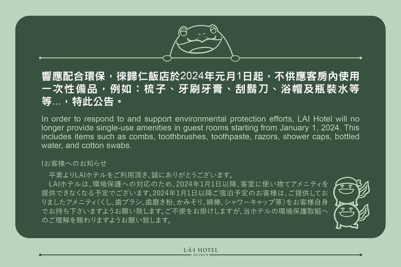 In order to respond to and support environmental protection efforts, LAI Hotel will no longer provide single-use amenities in guest rooms starting from January 1, 2024. This includes items such as combs, toothbrushes, toothpaste, razors, shower caps, bottled water, and cotton swabs.